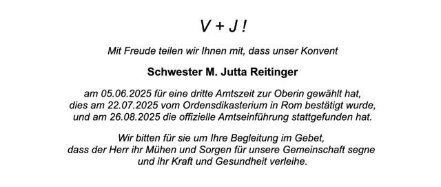 Am 12. September 2025, dem Fest Maria Namen, konnte Sr. Benedicta Döring auf 65 Jahre ihrer hl. Ordensprofeß zurückblicken. Wir feierten dieses seltene Jubiläum am Sonntag, 14. September mit einem feierlichen Gottesdienst, dem Pfarrer i.R. Josef Reindl vorstand. Während des…